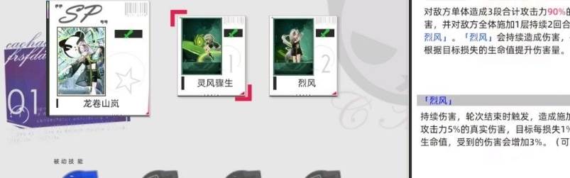 sp技能的激发“烈风”剩余回合的伤害量有倍率限制,最高倍率经过测试是“烈风”的基础倍率加上额外倍率乘以“烈风”层数乘以敌方数量再乘以“烈风”剩余回合的总共倍率不能超过技能描述倍率。