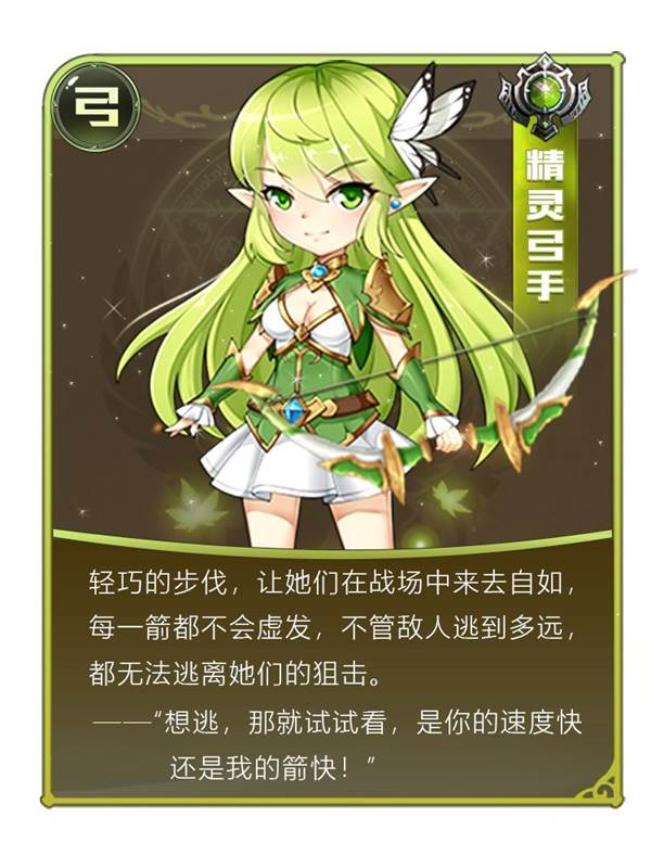 他们是精灵女王指定的守护者,一直生活在森林之中,并且肩负着守护森林、绝不让这片宁静被打破的重任,为此,他们隐匿于丛林之中,用敏捷的身姿在木林间来回穿梭,让敌人难以捕获他们的身影,除了敏捷、轻盈的身手,为了更好地守护森林,他们的弓箭还被精灵女王赋予了精灵之力,拥有着普通的弓箭所难以比拟的强大力量,面对这群灵活而百发百中的守护者,入侵者们往往被打得溃不成军,纷纷落荒而逃,退出丛林。