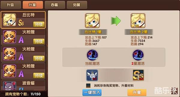 针对其不同培养方式带来的收益情况,采用不同的培养策略,主升星、吞噬还是觉醒(升级建议每一只都怼到能到的最高级就好啦),选取上述的首推阵容作为案例,可以让巴风特主要升星、丘比特&皮皮&熔岩巨兽主要升级觉醒技能,而守护天使则主要搞吞噬。