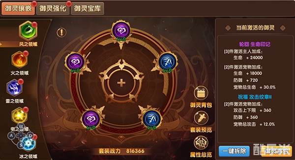 御灵为140级解锁的系统,类似于宠物的铭文,能够增加宠物的属性和人物的属性。冒险家们可以通过魔宠战场解锁御灵槽及获得御灵及用于强化御灵所需的御灵经验,此外也可以通过御灵宝库、声望商城获得御灵。