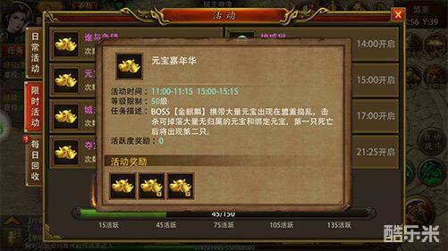 在每日指定时间段内,系统会在盟重城内刷新一只金麒麟BOSS,金麒麟BOSS会携带大量元宝出现,击杀之即掉落大量无归属的元宝和绑定元宝,第一只死亡后将出现第二只。