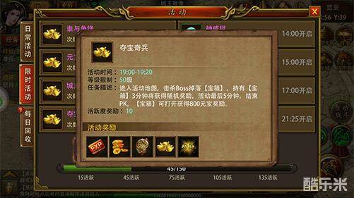 到达活动时间后,系统会弹出界面引导玩家进入夺宝奇兵地图,进入活动地图后,地图上刷新夺宝奇兵地图专属BOSS,击杀BOSS后必定掉落【宝箱】,但【宝箱】无法立即打开;【宝箱】持有者每三分钟可获得随机奖励(元宝、经验、金币、战神召唤令和功勋等),活动最后5分钟(即19:15~19:20)【宝箱】持有者可开启宝箱,并立即获得800元宝,此活动在活动时间内可自由进出地图。