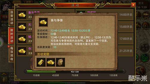 进入谁与争锋赛场后玩家可以在地图内自由PK,直至剩下一个玩家,谁与争锋赛场内PK不增加杀戮值,玩家死亡后被视为活动失败,立即被传送出赛场,谁与争锋赛场内死亡,包裹内的物品不会掉落,最后获胜的玩家会获得大量元宝、金币以及BOSS召唤令奖励。