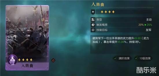 入阵曲的武力提升受武力加成影响,后期实际提升能达到130+,再加上35%的暴击率。