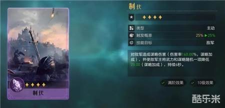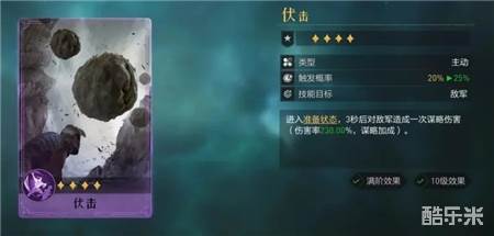 虽然卡面上的伤害率差距较大,毁灭高了95%。但伏击升星简单,满星后触发概率能到25%,此时再去对标白板毁灭差距就缩小了很多,阳谋和万里平戎策也是同理。