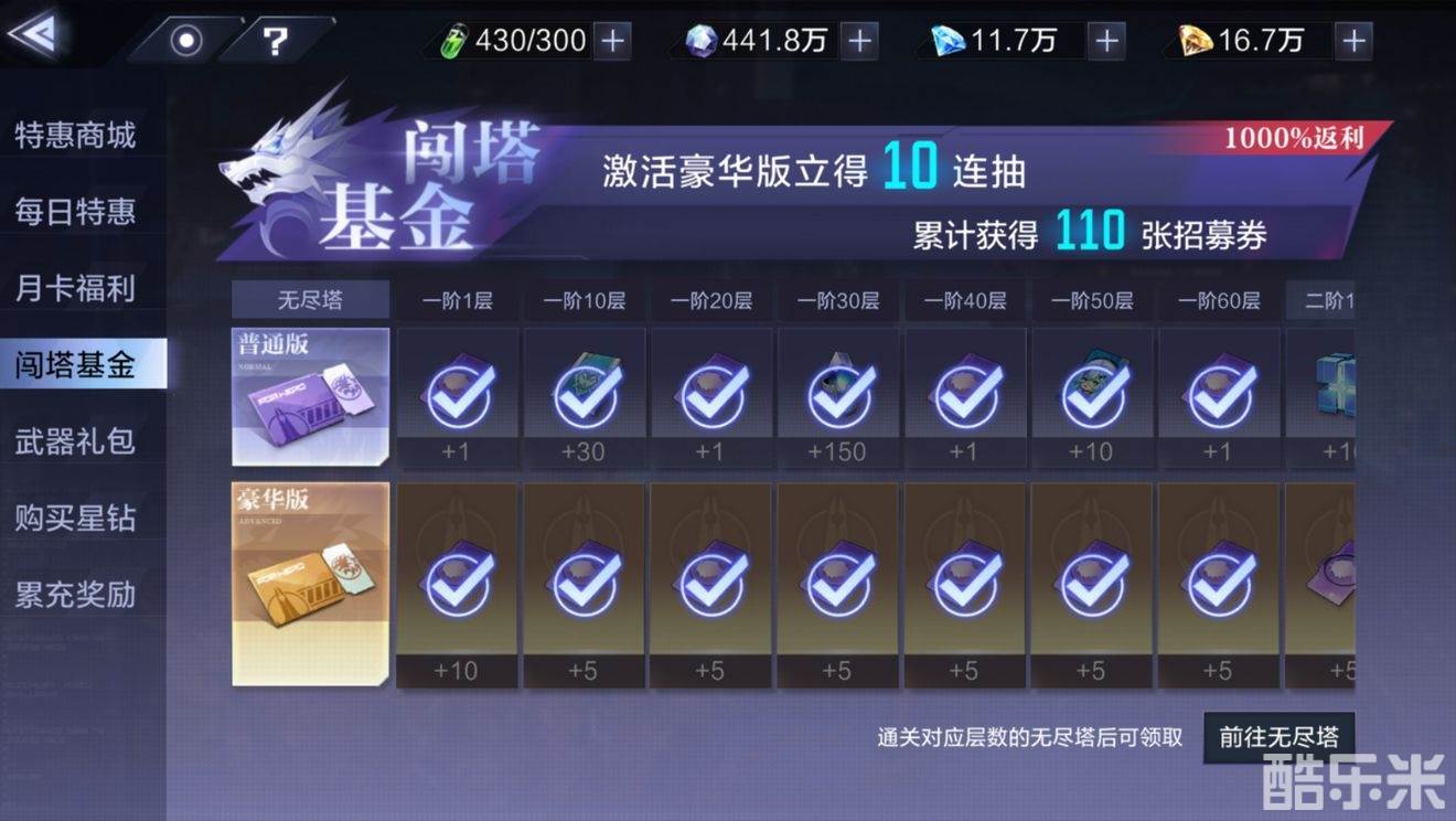 参与无尽塔闯塔玩法,挑战达到一定层数,可以在【闯塔基金】中领取对应的奖励。其中普通版的基金,闯塔至3阶60层,至多可以白嫖获得10张猎人招募券,豪华版基金虽然不属于白嫖范畴了,但是除了基础的10张之外,还可以额外获得100张招募券。