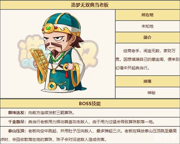 4.典当老板boss介绍:经商老手,阅宝无数,家财万贯。因想填满自己的藏宝阁,便来到幻境中开启典当行。