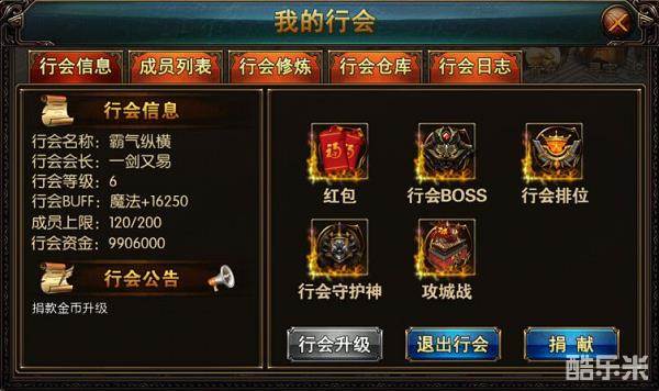 2、行会升级:消耗行会资金进行行会的等级提升,行会升级后行会成员上限减少,行会商店商品种类增多,行会仓库格子的数目增加、行会BUFF效果增强