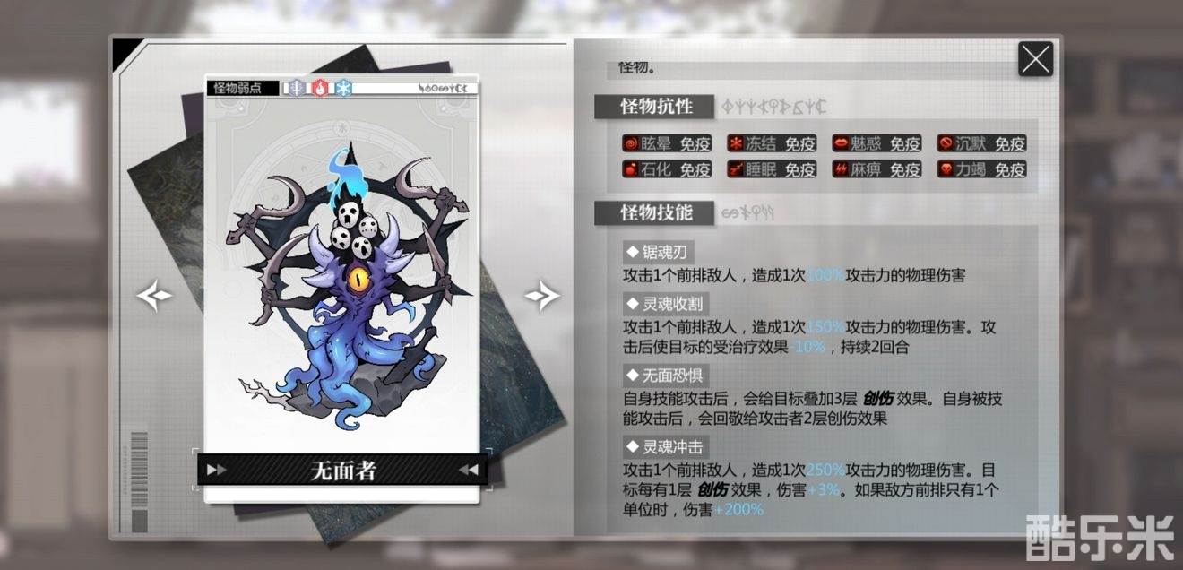 无面者:对前排可以造成巨额伤害,如果只有一个前排,大招技能【灵魂冲击】将额外造成200%伤害,所以推荐使用两个前排,朔耶真子的复活技能也是很不错的选择。及时回血基本能够很轻松地击杀。
