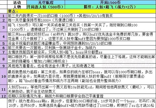 4.前三关boss都比较好打ss(40秒内)跳30步,所以buff优先选金卡免费的那几张,要舍得花金果几十就够了,这里不买人妖专属buff是因为要预留1000币买口粮。