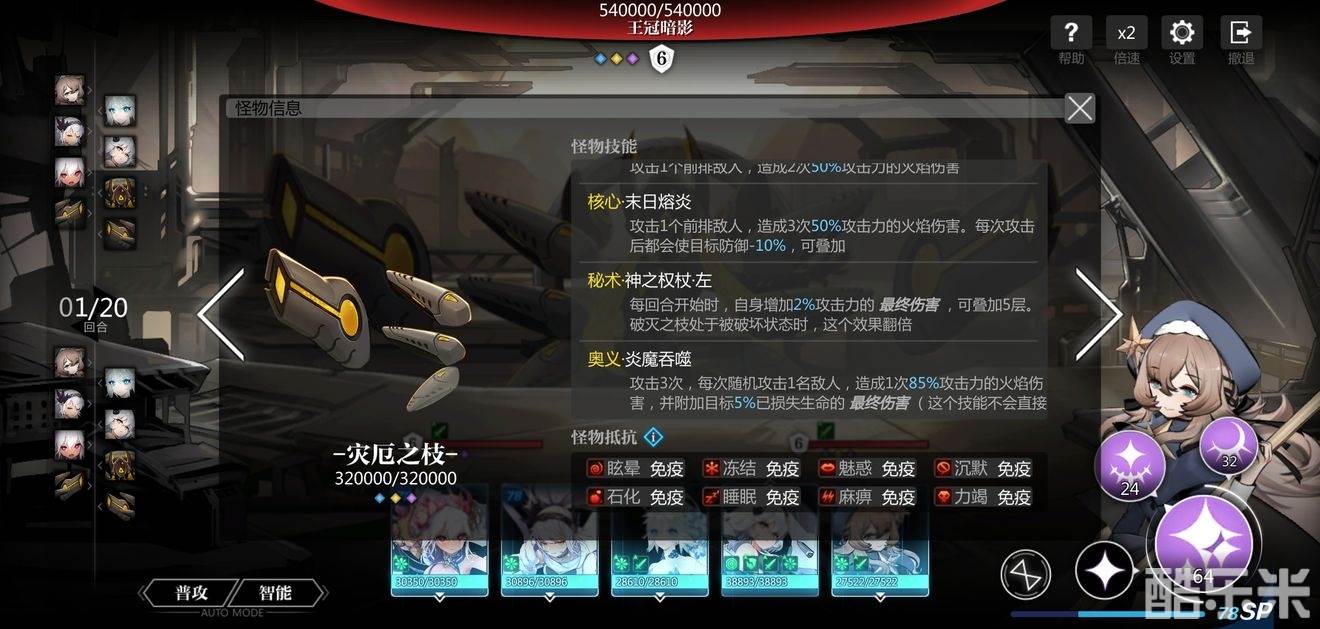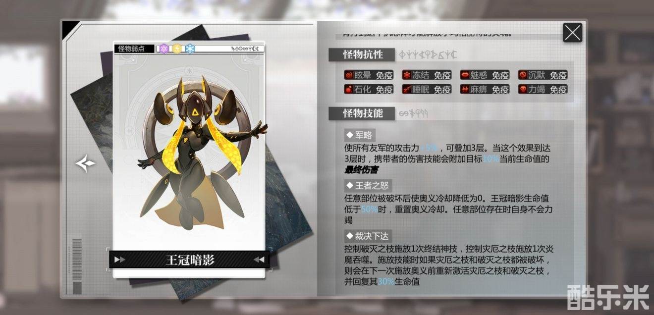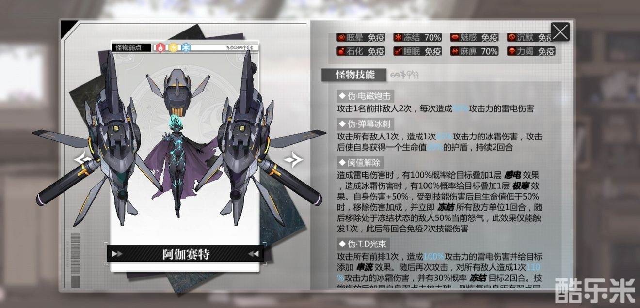 伤害很高,并且生命低于50%时会冻结我方所有人偶,所以在50%血线时注意让主C优先出手;之后每个回合都免疫前两次伤害,需要破盾手和辅助先垫刀,之后主C再输出,类似星见亚砂的核心技能能攻击两次的人偶也是不错的选择。