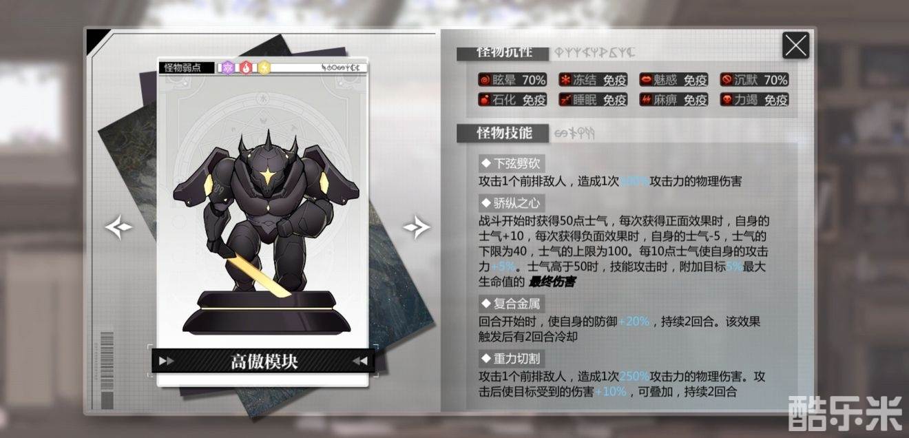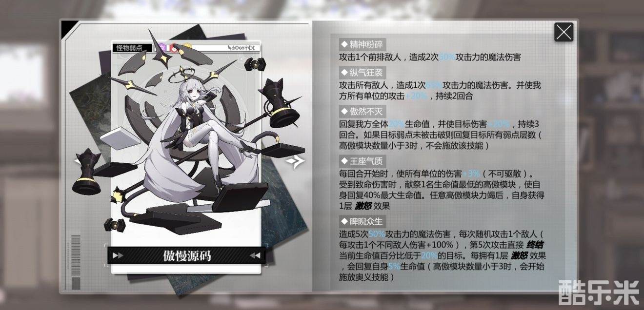 高傲模块不死,傲慢源码则不会死亡,高傲模块大于2时傲慢源码会群体回血和恢复弱点层数,小于3则会高频率释放奥义【睥睨众生】,还可以斩杀血量低于20%的人偶,同时还会恢复自身生命值,没有【嘲讽】的话,相当难扛住。