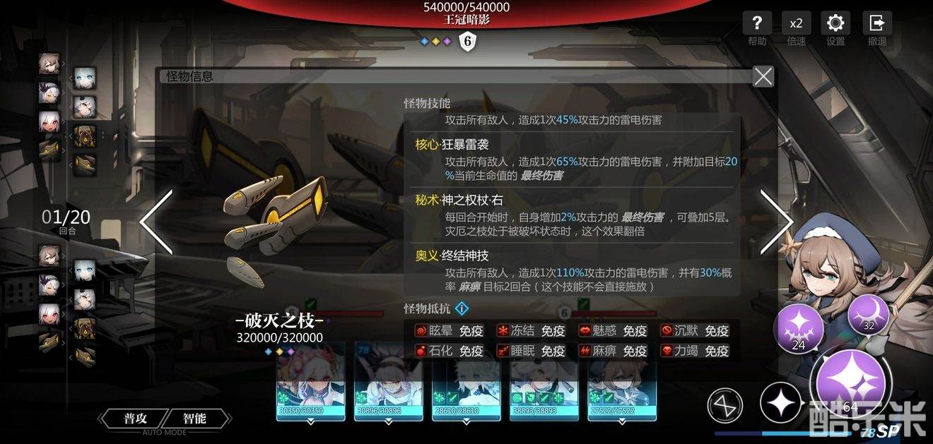 左手奥义【终结神枝】会攻击所有我方人偶,并且会造成麻痹,如果不能及时同时击杀三个地方单位,可以先去除左手,然后再慢慢磨血,两个手臂都休眠时,王冠暗影会空放一次奥义,也就是手臂都休眠之后还有一个回合可以进行输出,在复活前打死本体即可。