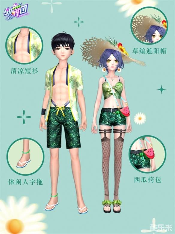 本期上新的活动服饰西瓜小子/西瓜甜妹,男女款服饰均以绿色为基调,清爽干净、时尚清新,简直是夏日的绝绝子穿搭!西瓜甜妹采用绿色抹胸吊带搭配深绿色短裤,甜酷热辣;再配上可爱俏皮的西瓜挎包,清新靓丽;休闲清爽的草编遮阳帽与性感的渔网袜搭配凸显服饰的休闲气质与热辣特色,十分适合作为海边度假的首选穿搭!