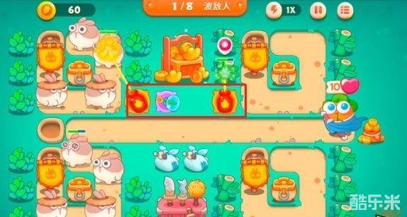 3.第三步在下排设置新炮塔,兔子快清完时让炮塔清理其他道具。