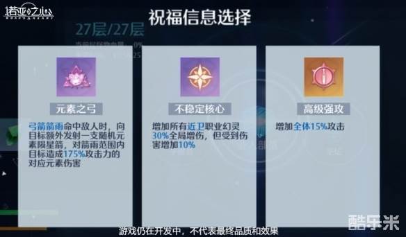 当击败怪物后会随机出现3个祝福效果,冒险家可以根据自身的需要选择其一,祝福效果分为:蓝色、紫色和金色三个品质,品质越高,祝福效果越强。
