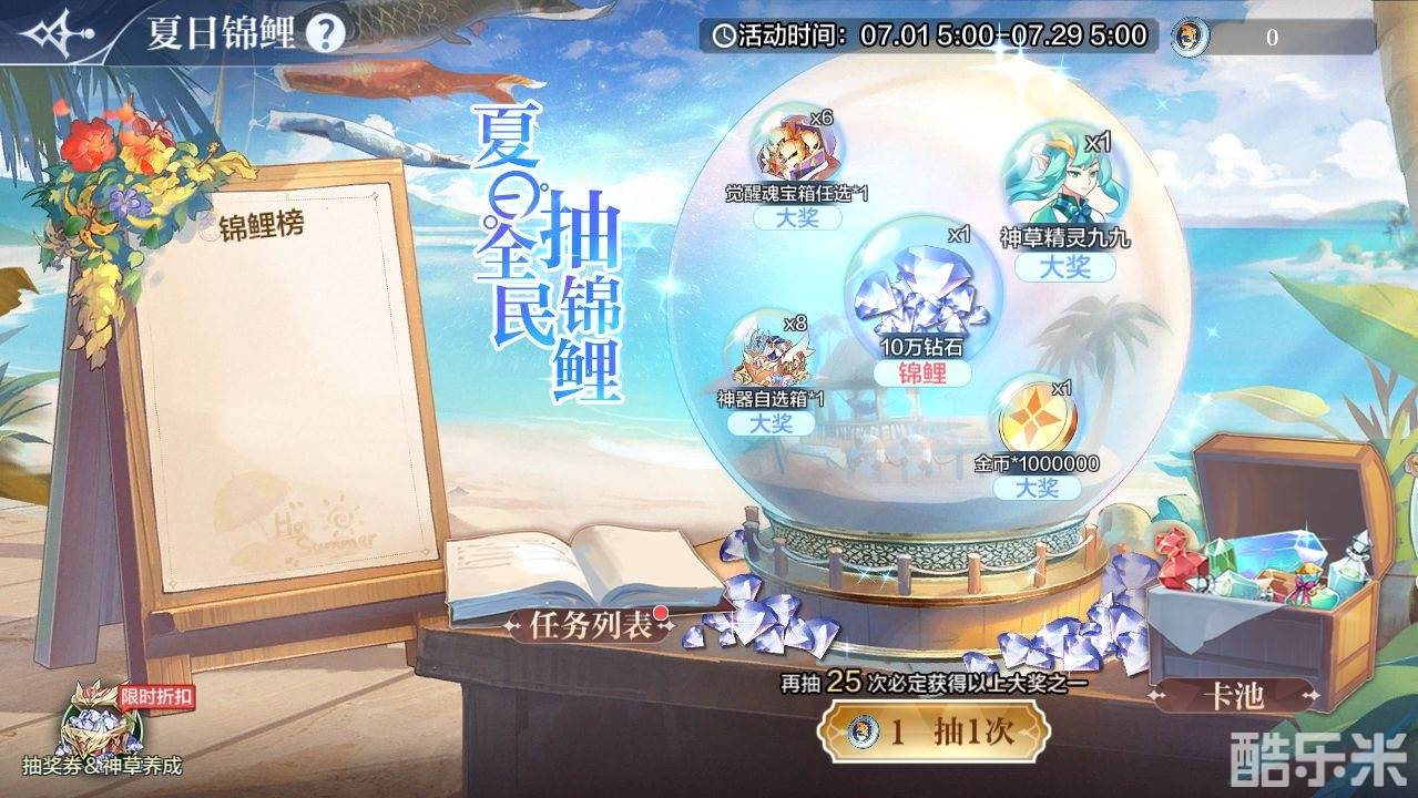 六、【夏日锦鲤】全民抽锦鲤,10万钻石、大师九九、觉醒魂、神器等你拿