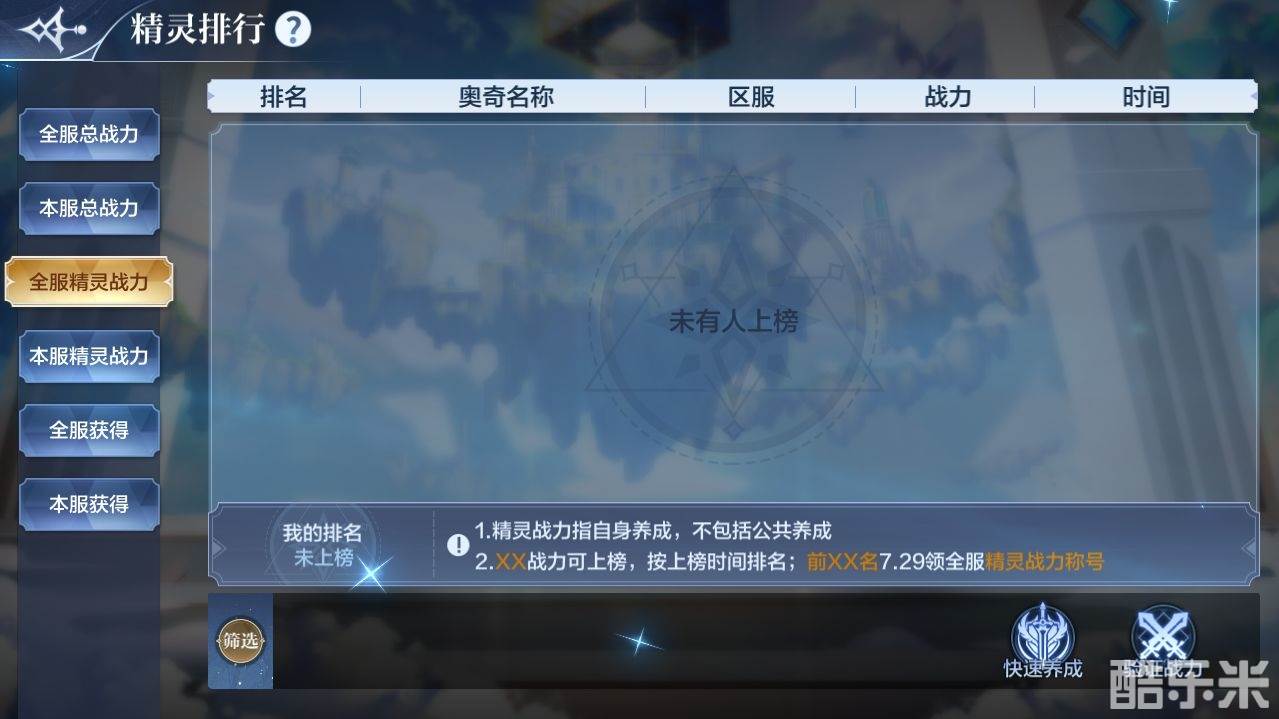 2、总战力,包含精灵自身养成和公共养成,根据战力由高到低排名,分为全服和本服榜