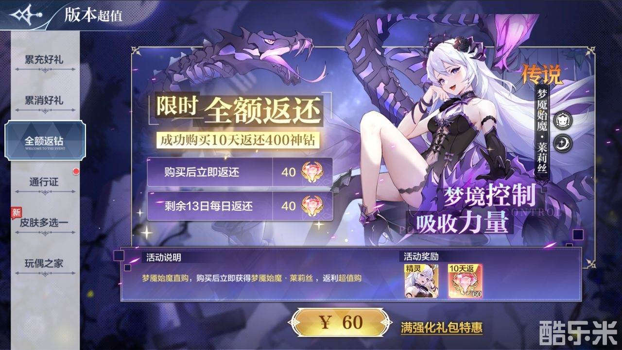 活动内容:梦魇始魔直购,购买后、立即获得梦魇始魔•莱莉丝,返利超值购,购买后邮件返还神钻持续10天。