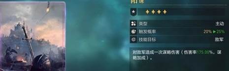 伤害率相对阳谋少了15%,但是多了一个降属性效果,持续时间达6秒,按照25%触发率平均是12秒一次,等于50%的覆盖率,降属性受谋略加成影响,最终效果在50点左右,折算成全覆盖就正好回到25点的样子。25点属性对技能加成的影响=25×0.3%=7.5%技能加成,一个300%伤害率的技能降低7.5%就是22.5%,如果按照对面主将2个输出技能、1个主将技来算,就是3个22.5%,哪怕他是武力和谋略随机降低,那也有一半对点,性价比高于阳谋,适合英雄和阳谋一样,谋略型英雄都可以。