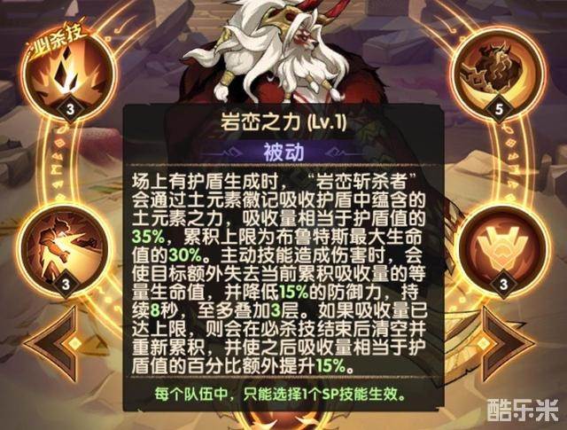 先看看它的觉醒技能“岩栾之力”(下图),场上只要有护盾生成,他的专属武器会通过土元素徽记来吸收护盾蕴含的土元素之力。主动技能造成伤害时,会额外失去的生命值跟这个吸收量同等数值,还降低敌人防御。这个觉醒技能说白了就是他那些主动技能的强化剂。