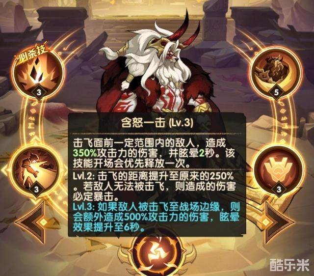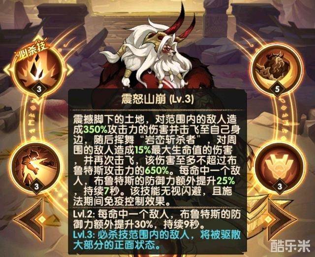 必杀技“震怒山崩”,看了下图,这个伤害还是特别高的,不但有350%的伤害输出,还挥舞专属武器对敌人造成最大生命值15%的伤害,生命值数值大他们的血就掉得多,但是不超过650%,650%这个数值也不少了。最厉害之处击飞敌人,还能无视闪避,对于闪避高的敌人就是一种威慑,品阶起来还能驱散敌人大部分增益,这也太赞了,每命中一名敌人已经还有提升防御力的福利。
