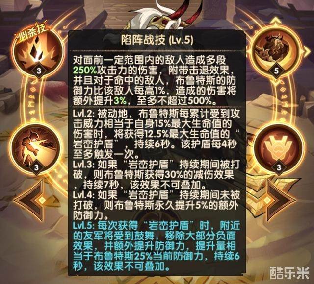 二技能“陷阵战技”,能击退敌人,防御越高伤害也会更高,战神受到伤害累计都一定的数值,还会获得护盾。该护盾被打掉,会有免伤效果,否则会永久叠加防御力,这样对敌人的伤害还会越高,这个技能太赞了,既能自保还能伤敌。开启专属武器“岩岱斩杀者”开启下面的能力。