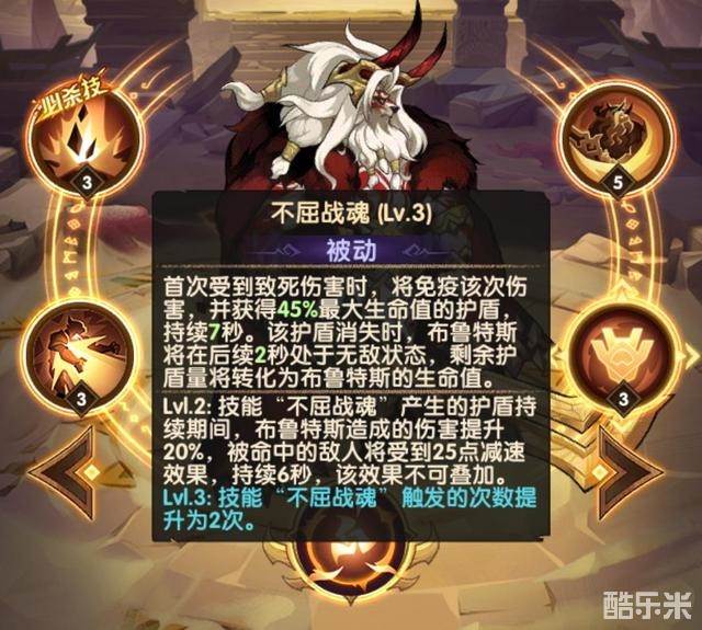 四技能“不屈战魂”,这个技能可以保两次生命,受到致死攻击获得生命护盾保一命,护盾消失,无敌效果出来又保一命,以前的无敌技能的升级版,专属家具收集满后可以触发两次。