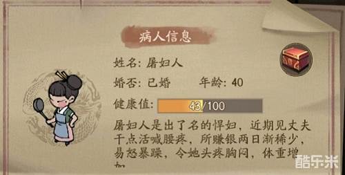 在叫我大掌柜游戏中很多玩家还不清楚,病人屠妇人的药方配方是什么。接下来就让小编给大家带来《叫我大掌柜》屠妇人配方攻略,感兴趣的小伙伴们一起来看看吧。