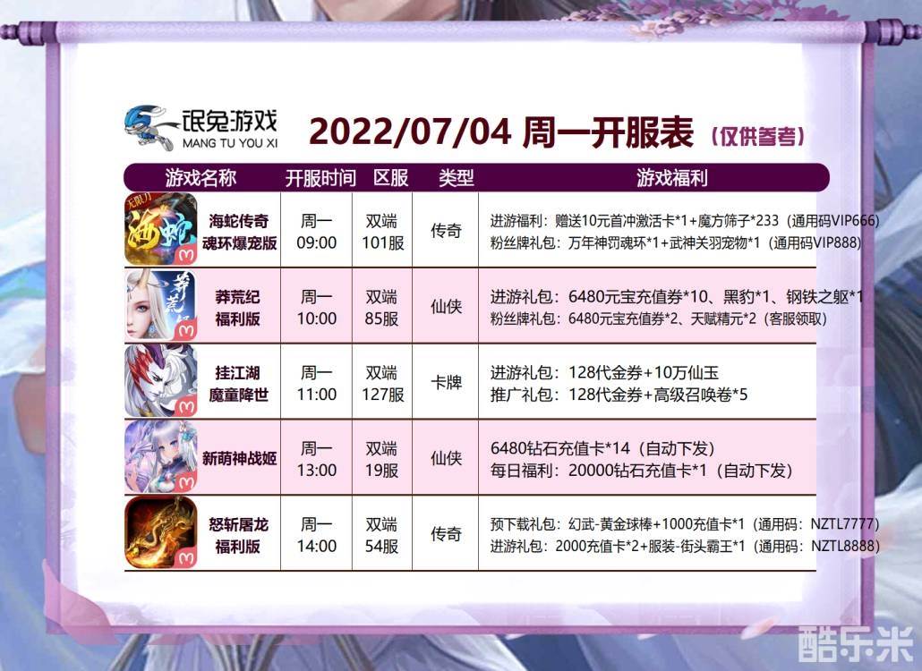| 莽荒纪-福利版 | 85区( 苹果- 安卓) | 2022-07-04 10:00:00 |