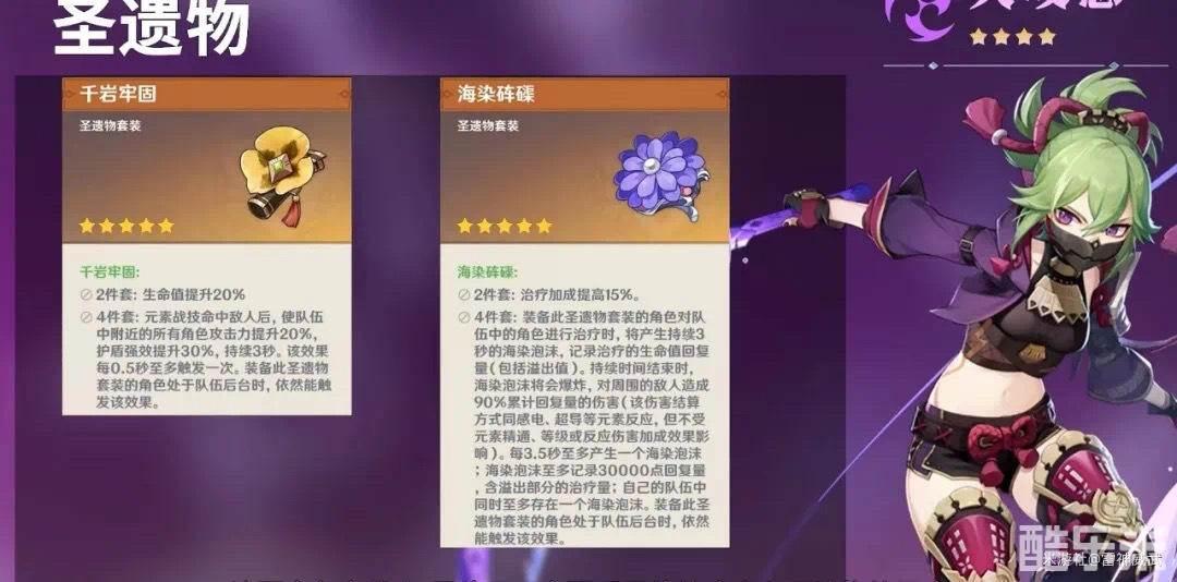 如果不知道选哪套,也可以用排除法,队伍其他角色都不缺攻击力的话,就给久岐忍带海染套,反之带千岩套;或者是看你需要哪个副本掉落的另一种圣遗物,哪套对你有用,就打哪个副本,这样可以让体力的收益最大化。