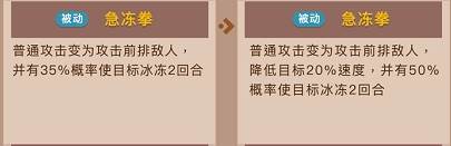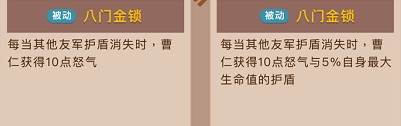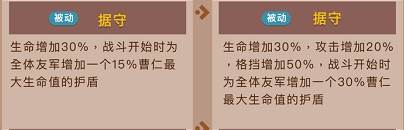 技能解析:这个就不需要讲太多了,增加曹仁的技能频率,放更多的技能,刷新更多的护盾出来。觉醒后额外增加了曹仁的坦度。
