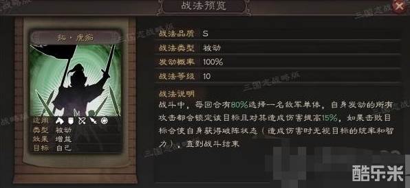战法效果:每回合80%概率锁定单体,击败目标后获得破阵(无视防御)