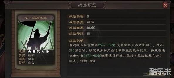 战法效果:增加奇谋几率和20%奇谋伤害,为主将分坦伤害(自身为主将时不生效,仅分坦效果不生效)