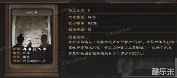 长蛇阵最好的搭配是和藤甲兵同队,组成双抗阵容,如果单个长蛇阵遇到纯兵刃队相当于“让”个战法,比如蜀枪遇到虎臣弓,就像藤甲兵碰到五谋臣兵刃减伤相当于没起作用。