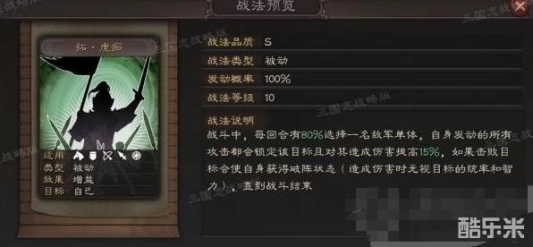 战法效果:每回合80%概率锁定单体,击败目标后获得破阵(无视防御)
