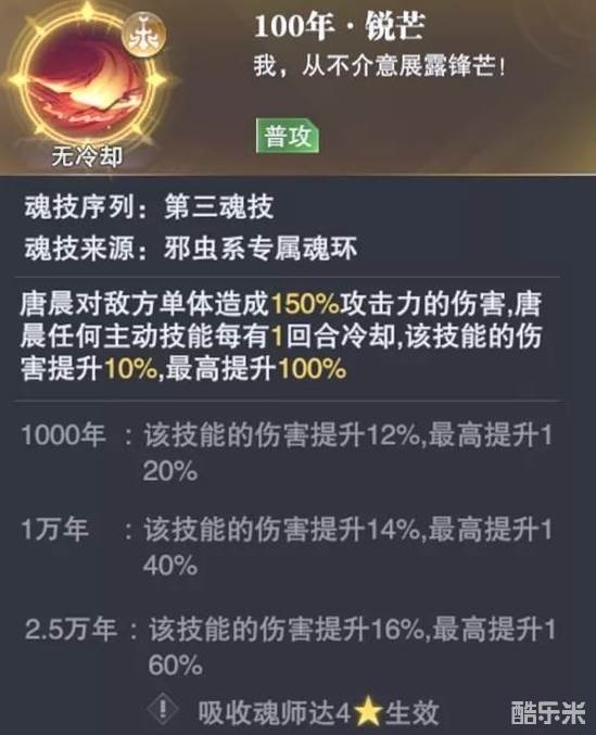 3.第三魂环选择锐芒,可以对单体造成百分之150的攻击伤害。