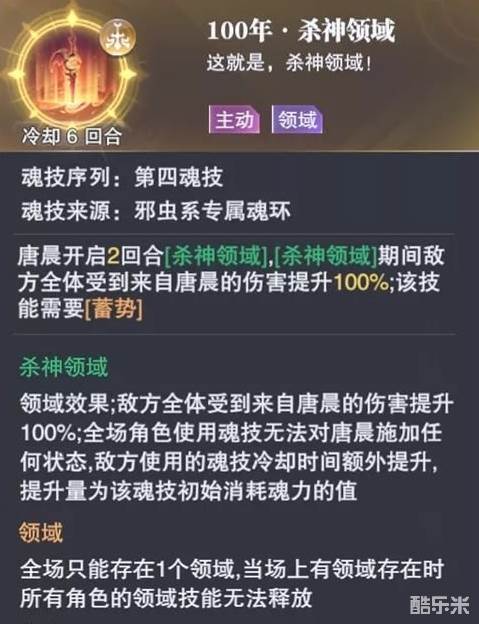4.第四魂环选择杀神领域,在开启的2回合内伤害可以提升百分之100。