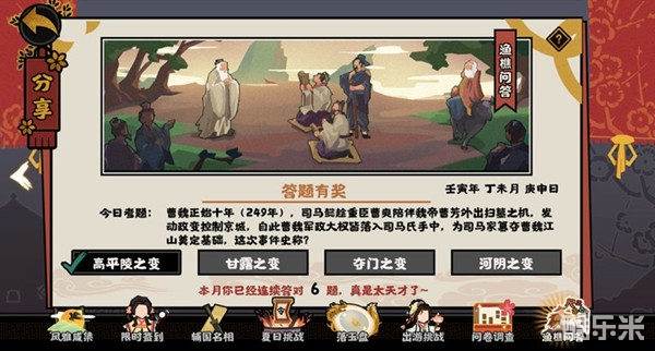 1.今日考题:曹魏正始十年(249年),司马懿趁重臣曹爽陪伴魏帝曹芳外出扫墓之机,发动政变控制京城,自此曹魏军政大全皆落入司马氏手中,为司马家篡夺曹魏江山奠定基础,这次事件史称?