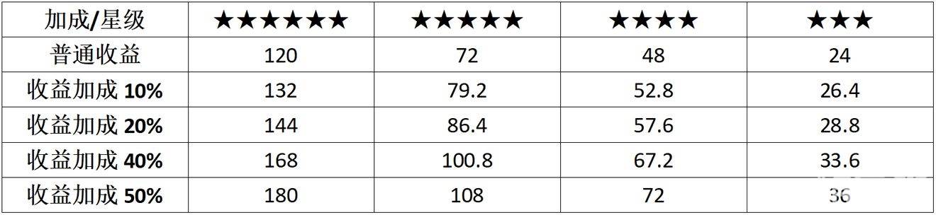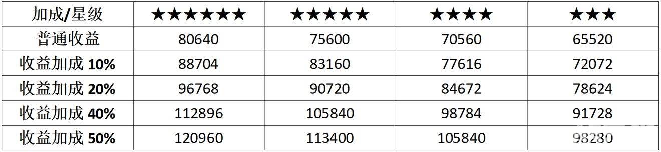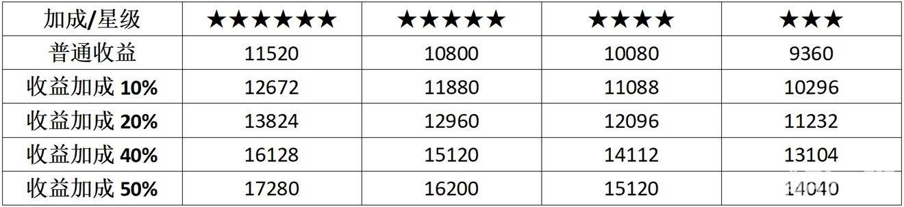 (区域级别不同仅影响银帕收益,本表只统计5级区域收益)