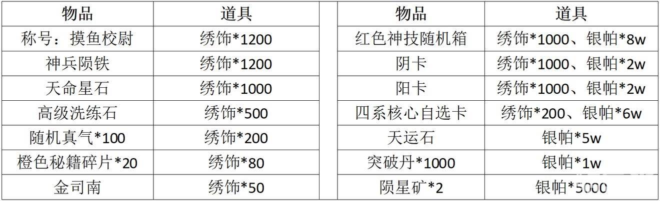2.兑换建议(个人向):摸鱼称号必拉满(就算前期不换,后期也是一定要换满的)。其余道具中,天命石、神兵石、阴阳卡、天运石,皆可以根据个人需求兑换。