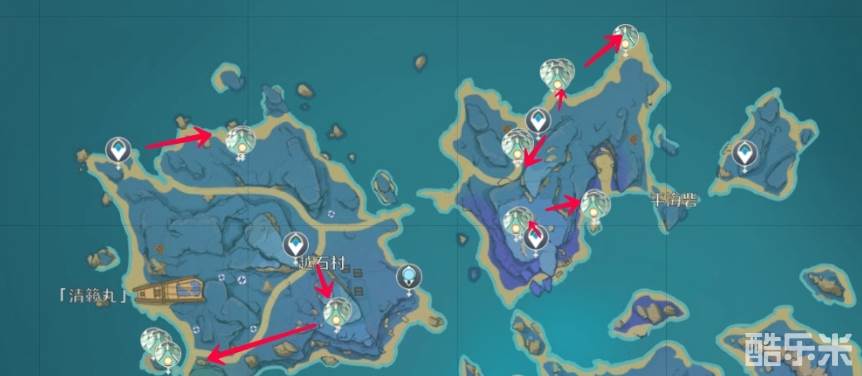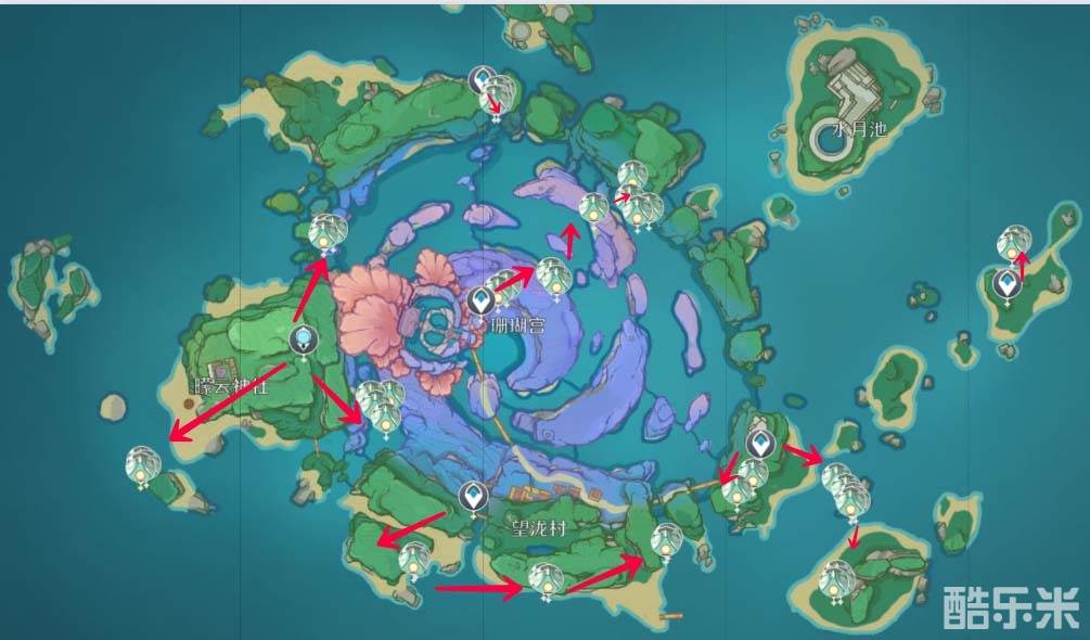 传送右侧锚点,向西北方前进,在神龛附近,可以引出漂浮灵。然后传送回锚点,向东南方向,沿着海岸线行走,靠近以后也会出现漂浮灵,然后继续沿着海岸线走,在一个大石头附近,靠近会有漂浮灵出现,然后继续沿着海岸线不远,可以看到三只分散的漂浮灵,打完以后,可以使用莫娜、神里等渡河角色到对岸,也可以选择到之前的石头处,游到对岸吗,也是沿着路线走就可以,除了一只漂浮灵会在QQ人营地里面藏着,其他都可以直接看到。