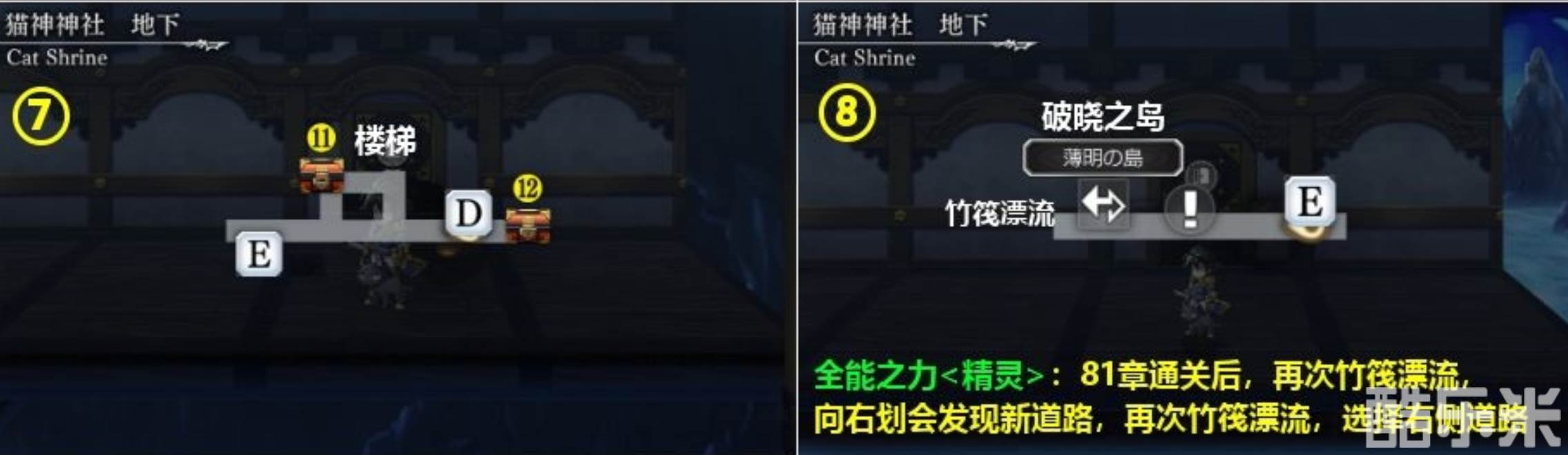 一直乱跑的猫可以点它,也可以拿老鼠玩具给它)→猫神神社地底→竹筏漂流→VS妖玄水释(弱地雷阴晶)→破晓之岛→81章END