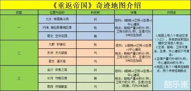 除君临以外,游戏中共有九大洲,而奇迹战场就在各大洲中心的位置。经过数据整理、汇总分析,我将所有的九个奇迹战场分为三种类型,如下图所示。