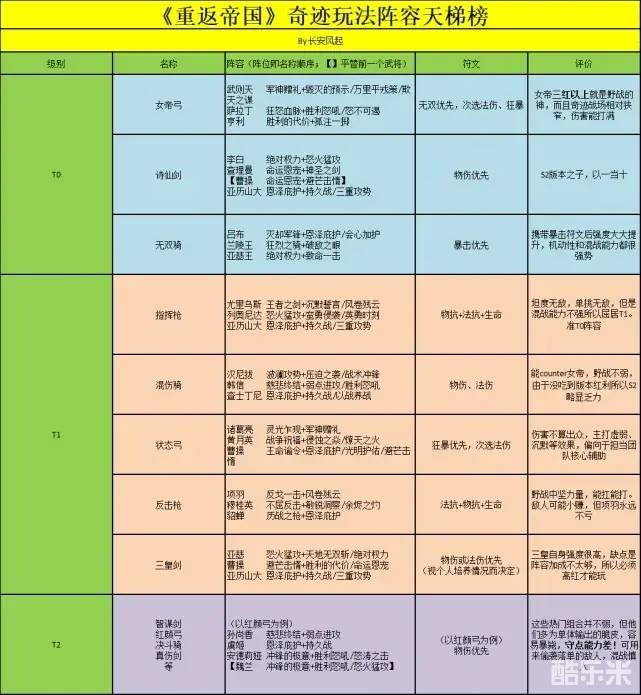 结合上面提到的占点机制、不死兵复活机制和符文系统,我整理了一套奇迹玩法阵容天梯榜,供大家参考。排名的主要依据是混战输出能力和坦度,如有疏漏之处欢迎大佬指正。