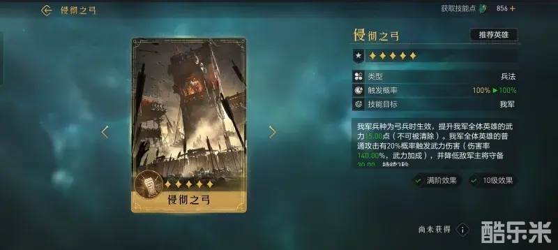 该技能为辅助技能,可以稳定提升武力伤害,并能够在普攻时降低敌方守备值,适合红颜弓、追击弓和统率弓。