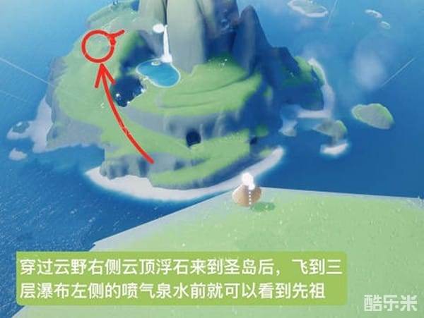 1:我们首先需要穿过云野右侧的浮石进入圣岛之后,然后我们在飞到三层瀑布左侧的喷漆泉水这边就可以看到总裁头先祖了;
