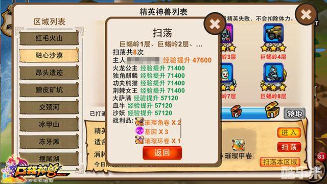点开精英神兽任务列表,对已经打通的精英神兽关卡进行扫荡,最后会获取少量的基因点。一般获得的只有几点,虽然是比较少,不过蚊子再小也是肉,能够在获取大量经验的同时还有基因点入账也是不错的。做人呢,最重要就是开心~