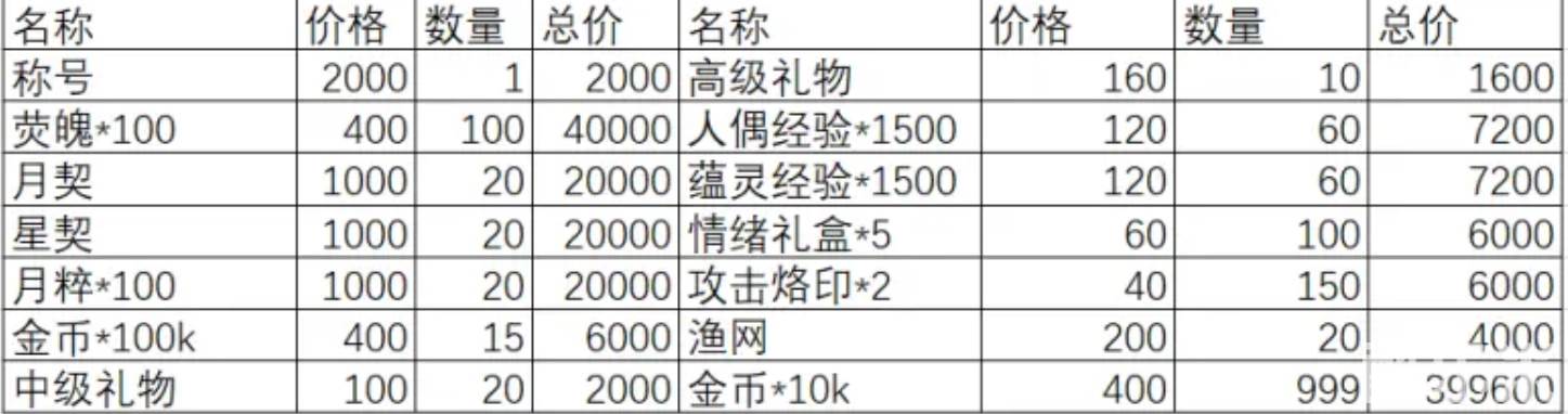 1.称号;荧魄;金币;星契;月契;月粹,合计:108000(十万八千)代币;