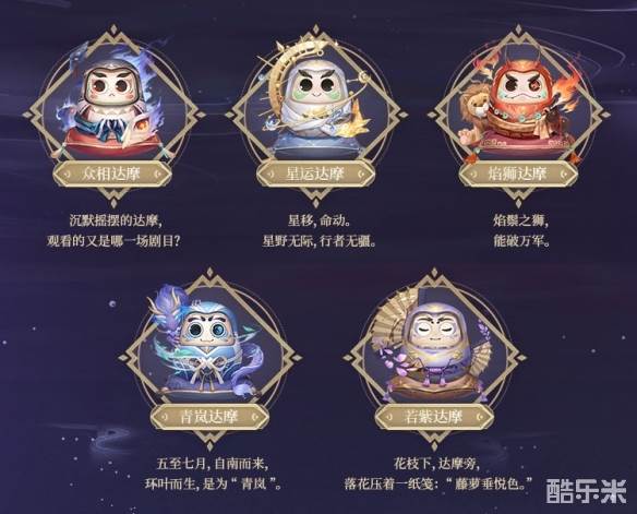 ► 在【达摩工坊】中完成合成达摩小游戏,赚取【达摩币】兑换5位男主专属【纪念品达摩】。